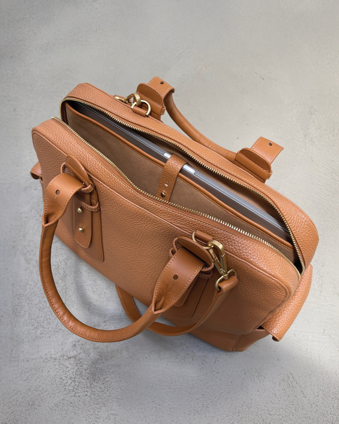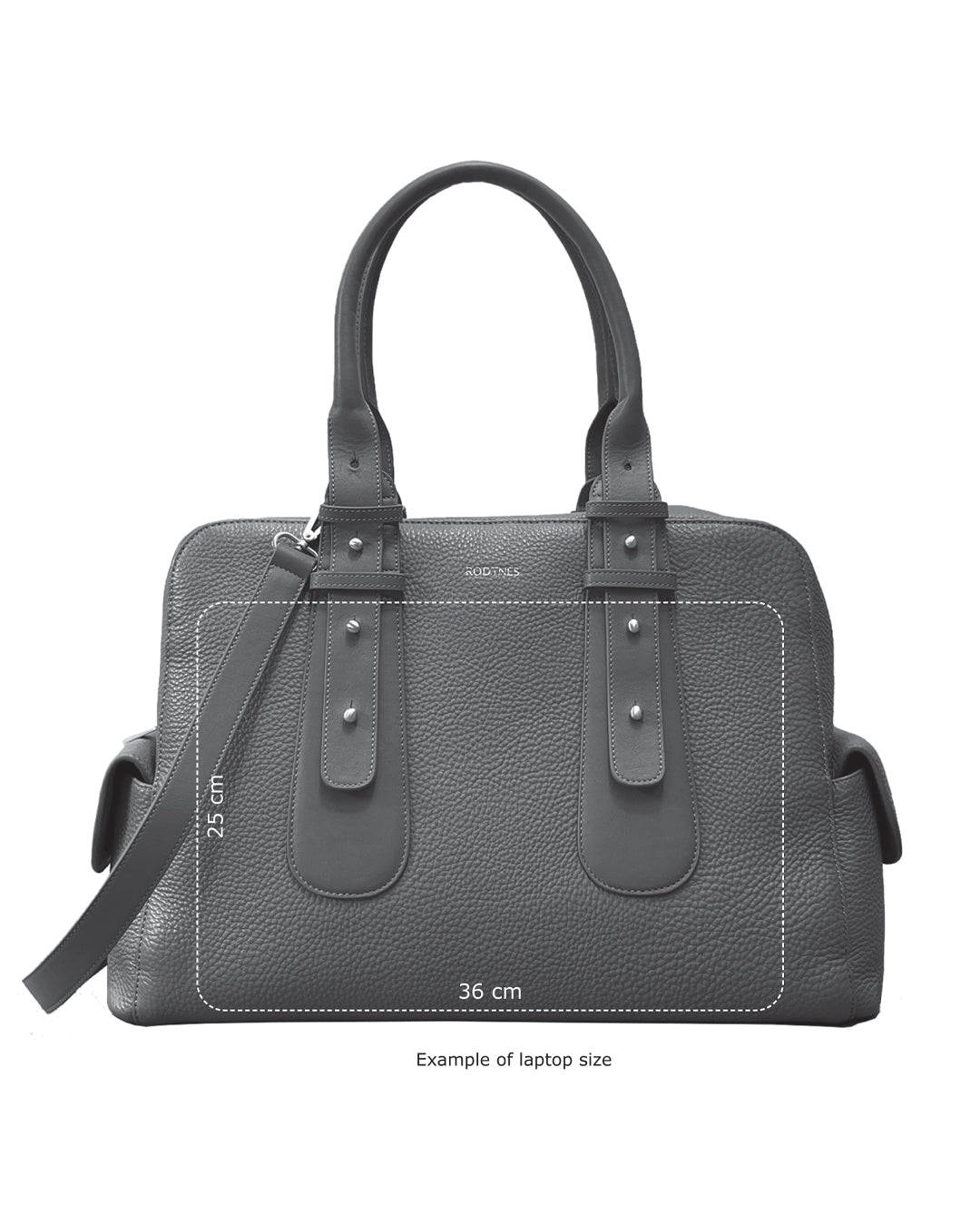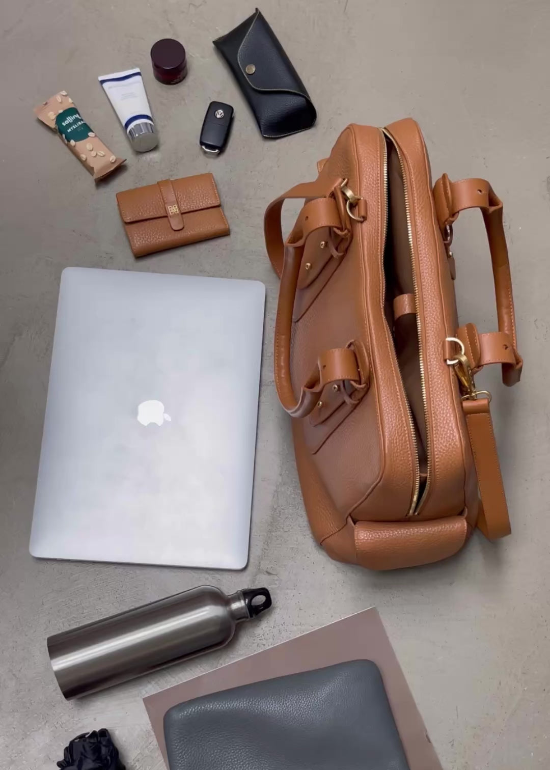 The Loretta workbag is the combination of a laptop bag and a handbag. It is spacious and will fit a laptop (up to 36 cm on the longest side, as seen in the picture) as well as all the other items you would put in your bag on a normal day. The bag is characteristic by its’ adjustable handles, which will fit over the shoulder in the position you see in the pictures, but which can also be extended or shortened. The Loretta Bag is a soft laptop bag, made of thick, grained calfskin leather of the highest quality.
