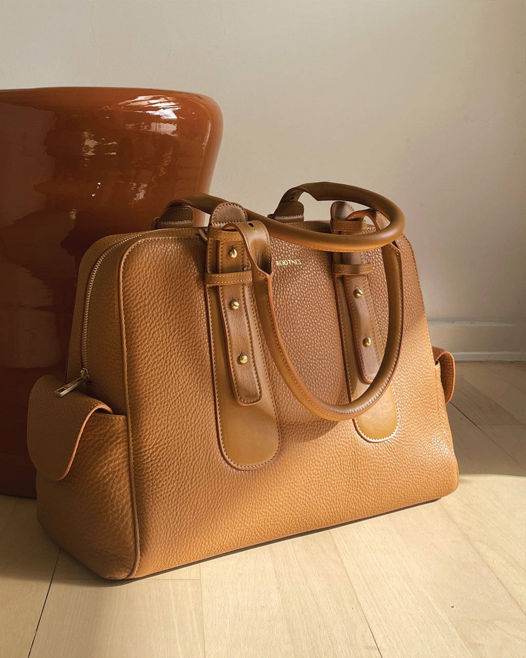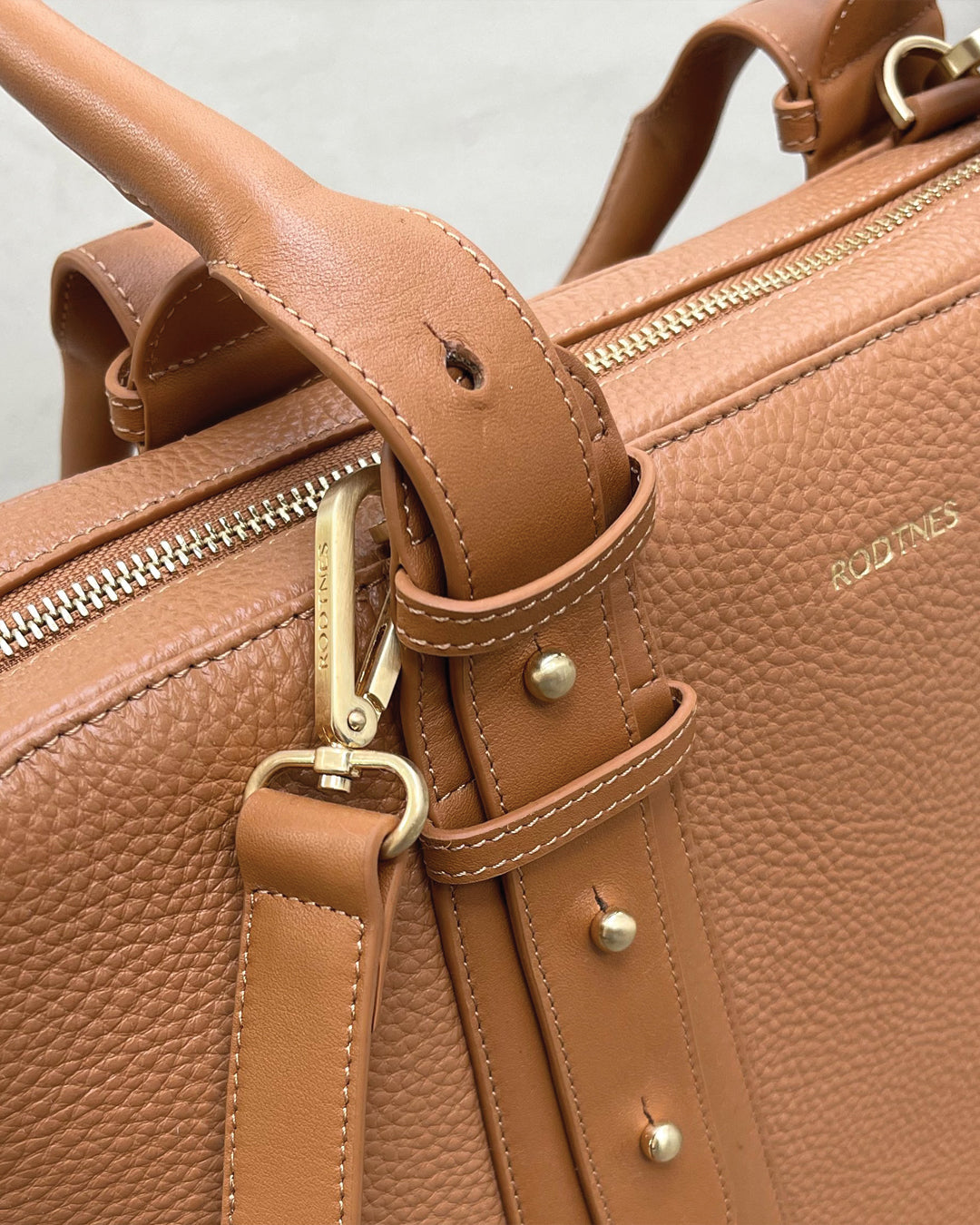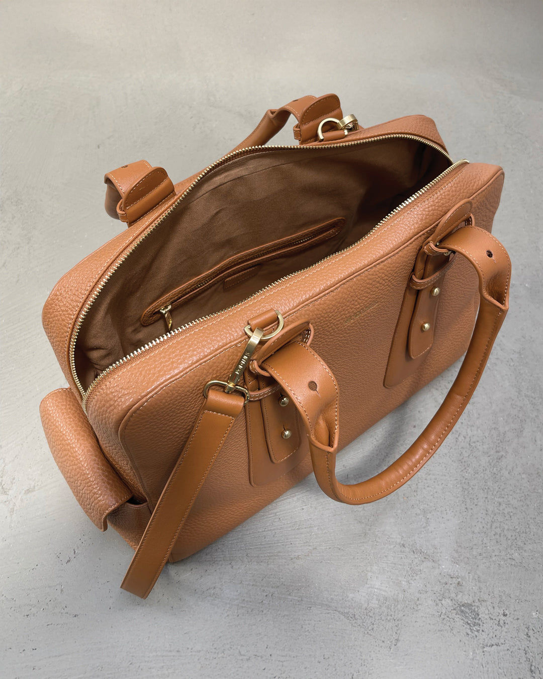 The Loretta workbag is the combination of a laptop bag and a handbag. It is spacious and will fit a laptop (up to 36 cm on the longest side, as seen in the picture) as well as all the other items you would put in your bag on a normal day. The bag is characteristic by its’ adjustable handles, which will fit over the shoulder in the position you see in the pictures, but which can also be extended or shortened. The Loretta Bag is a soft laptop bag, made of thick, grained calfskin leather of the highest quality.