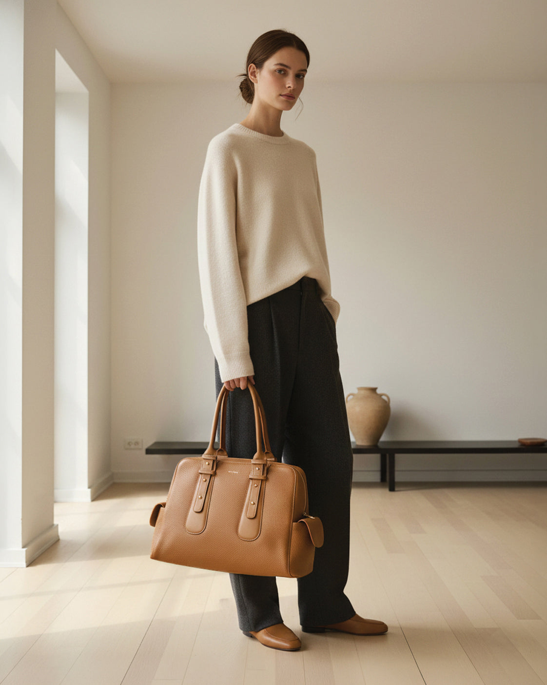 All RODTNES bags are crafted from 100% natural, premium-quality calfskin leather. The grained surface appears through a specialized treatment - a type of “washing” process - that causes the leather to shrink, allowing the hide’s natural grain to emerge. This results in a rich, thick, and structured leather with depth and character.