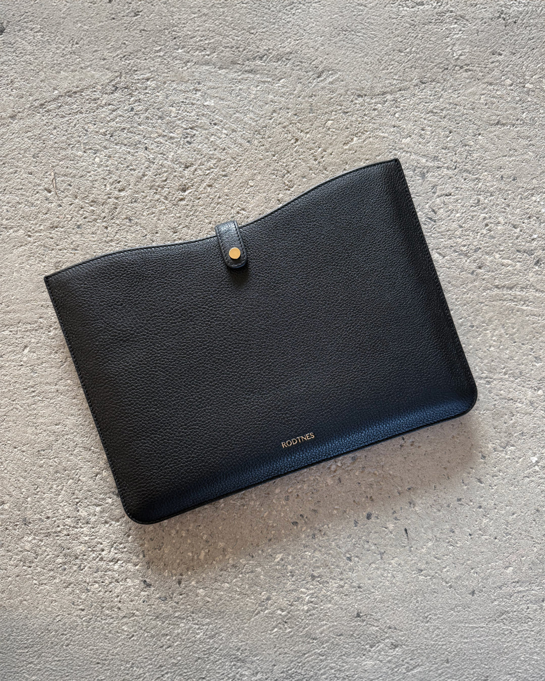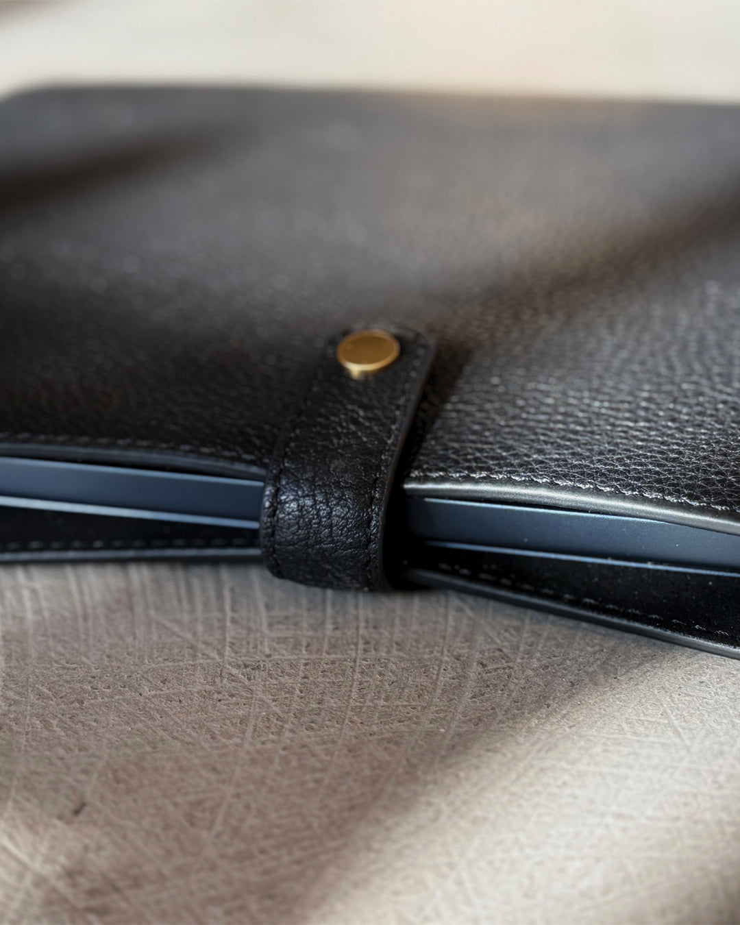 This luxurious laptop sleeve combines sophistication with functionality. A sleek, brushed gold button secures your device, while the padded interior ensures superior protection. Designed with a gracefully curved top edge, it exudes a subtly feminine charm - perfect for women who value both style and practicality.