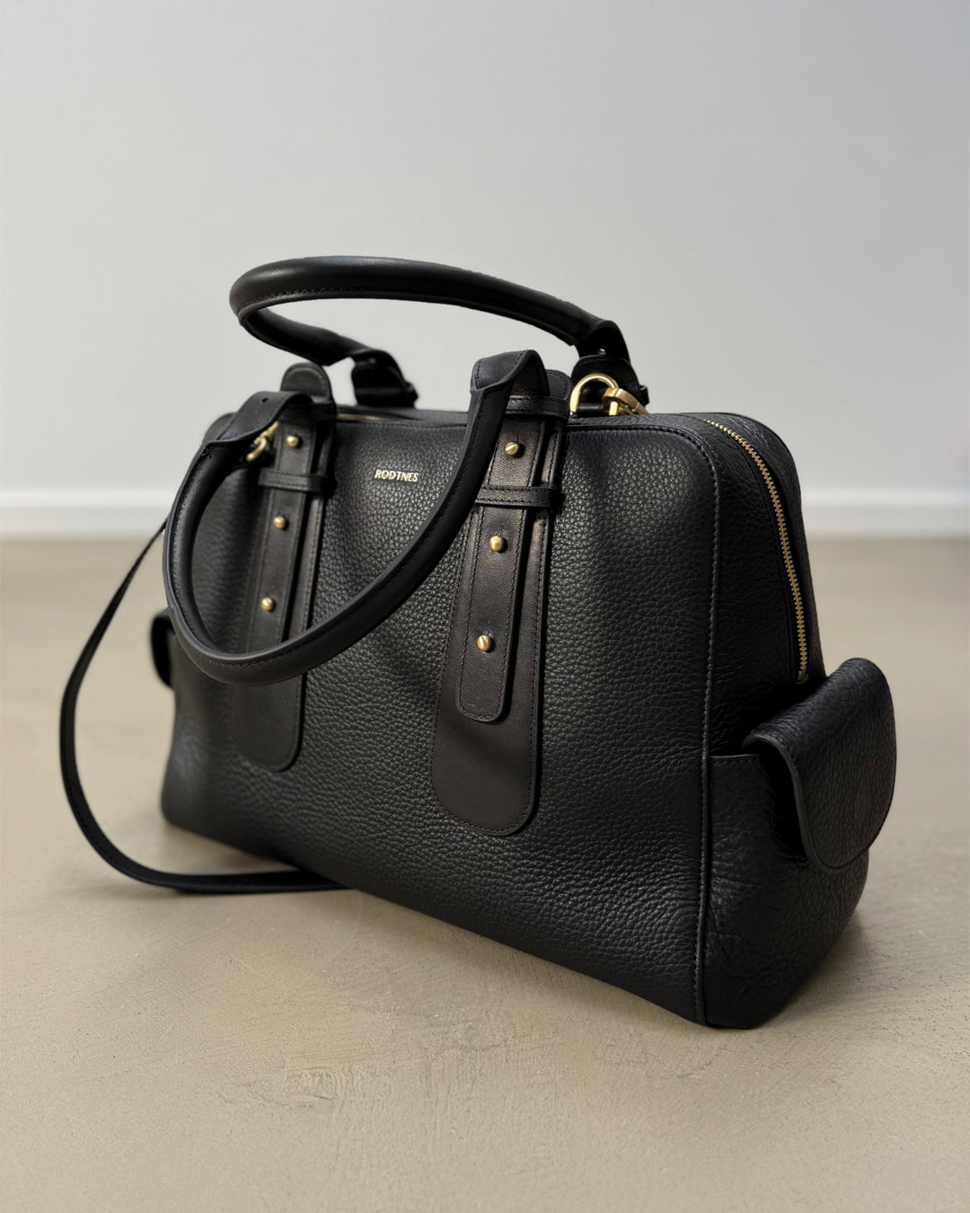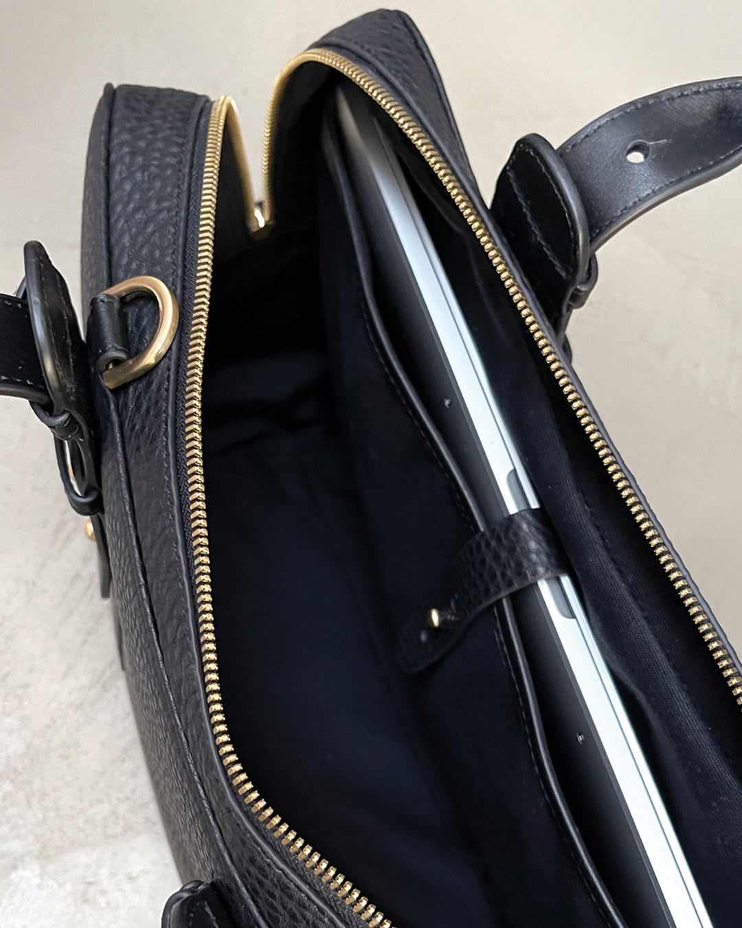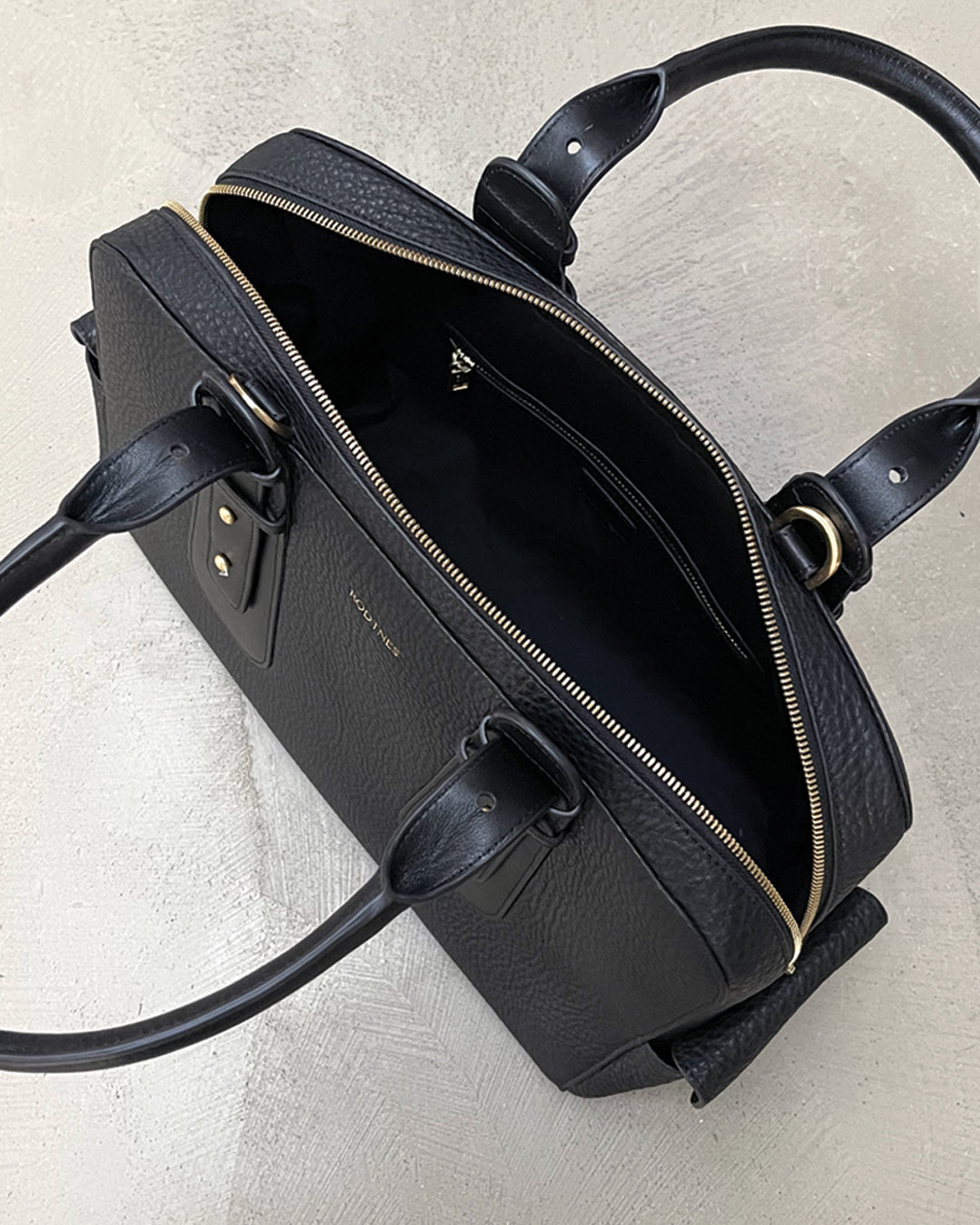The Loretta workbag is the combination of a laptop bag and a handbag. It is spacious and will fit a laptop (up to 36 cm on the longest side, as seen in the picture) as well as all the other items you would put in your bag on a normal day. The bag is characteristic by its’ adjustable handles, which will fit over the shoulder in the position you see in the pictures, but which can also be extended or shortened. The Loretta Bag is a soft laptop bag, made of thick, grained calfskin leather of the highest quality.