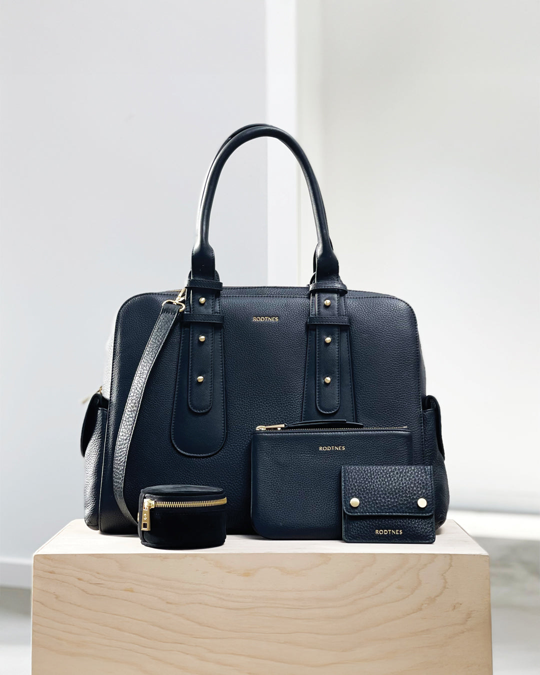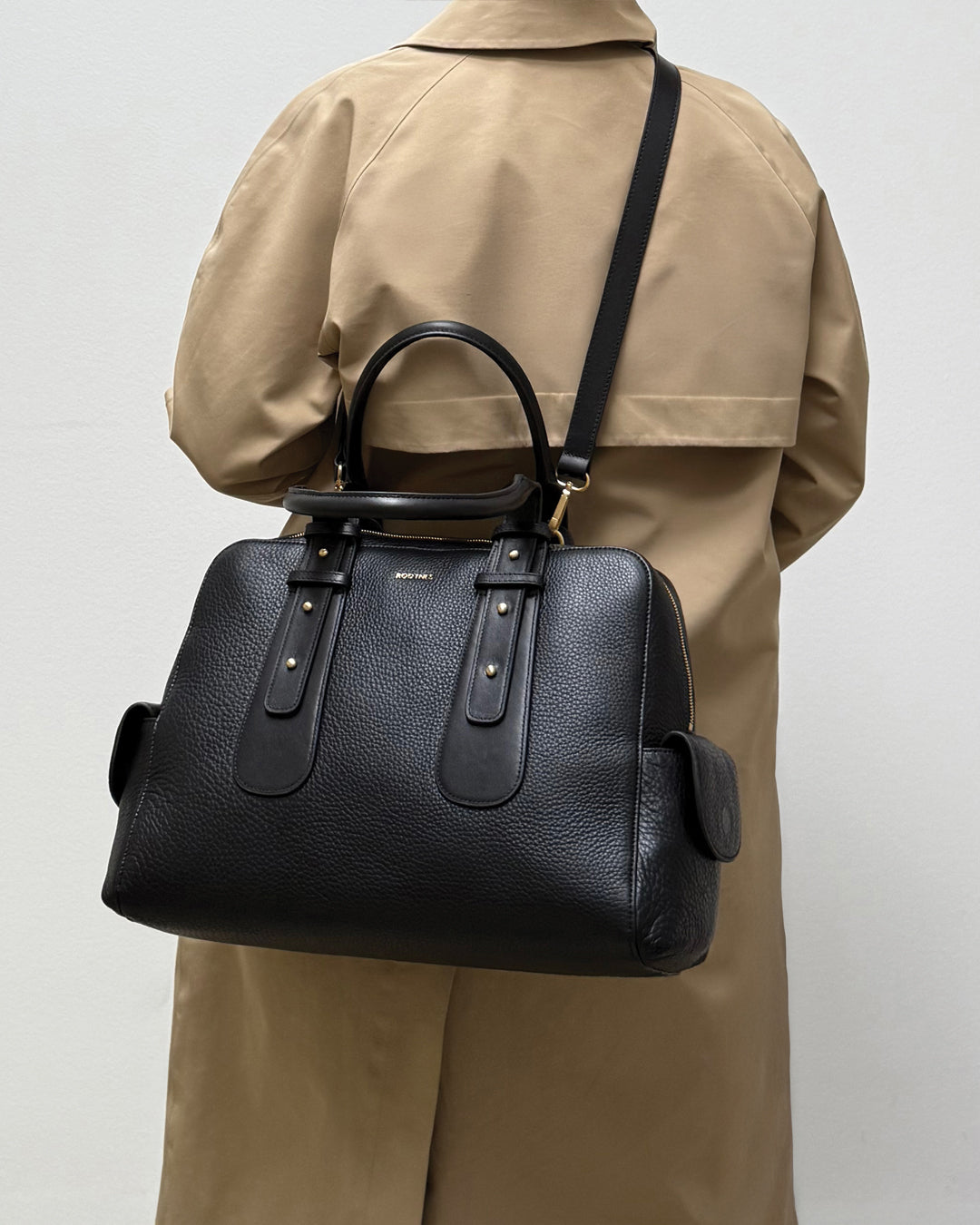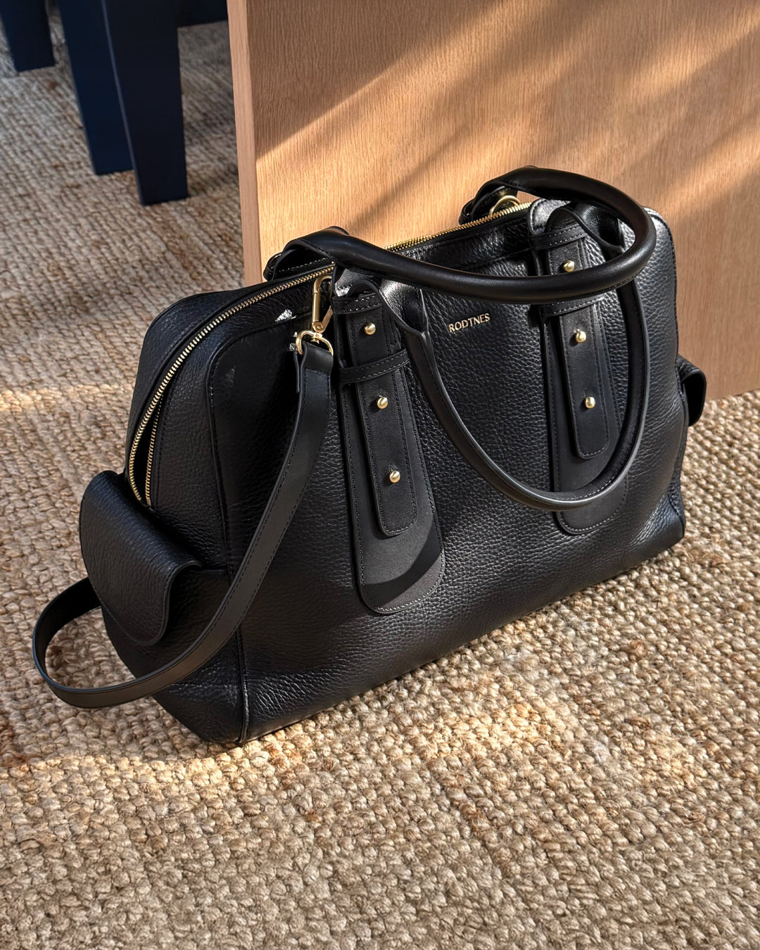 The Loretta workbag is the combination of a laptop bag and a handbag. It is spacious and will fit a laptop (up to 36 cm on the longest side, as seen in the picture) as well as all the other items you would put in your bag on a normal day. The bag is characteristic by its’ adjustable handles, which will fit over the shoulder in the position you see in the pictures, but which can also be extended or shortened. The Loretta Bag is a soft laptop bag, made of thick, grained calfskin leather of the highest quality.